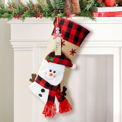 MinetomBrighten your mantle with Minetom's 18" Christmas Stockings, featuring a charming snowman design, burlap and plaid accents, and customizable name tags. Perfect for adding a personal touch to holiday decor!