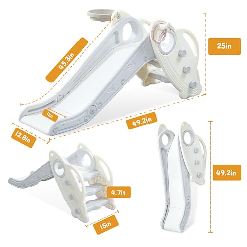 The slide also comes with several features to make it even more enjoyable. For example, there are basketball hoops and throwing games on both sides of the slide, as well as rings provided for added fun. There is also a handrail that is easy for kids to grip, which ensures that they climb safely. Additionally, there is an extra long slipping slope at the end of the slide with a buffer combination, so kids can stop safely instead of ending up on the floor.